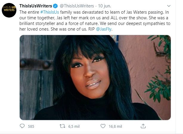 "Toda la familia #ThisIsUs quedó devastada al enterarse del fallecimiento de Jas Waters. En nuestro tiempo juntos, Jas dejó su huella en nosotros y en TODO el espectáculo", se indicó con dolor.