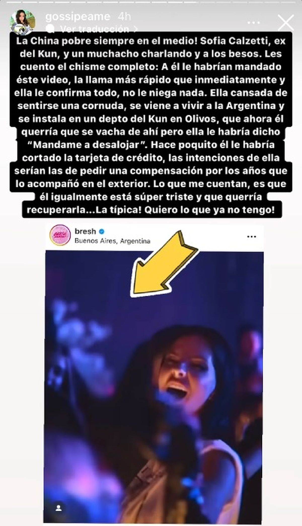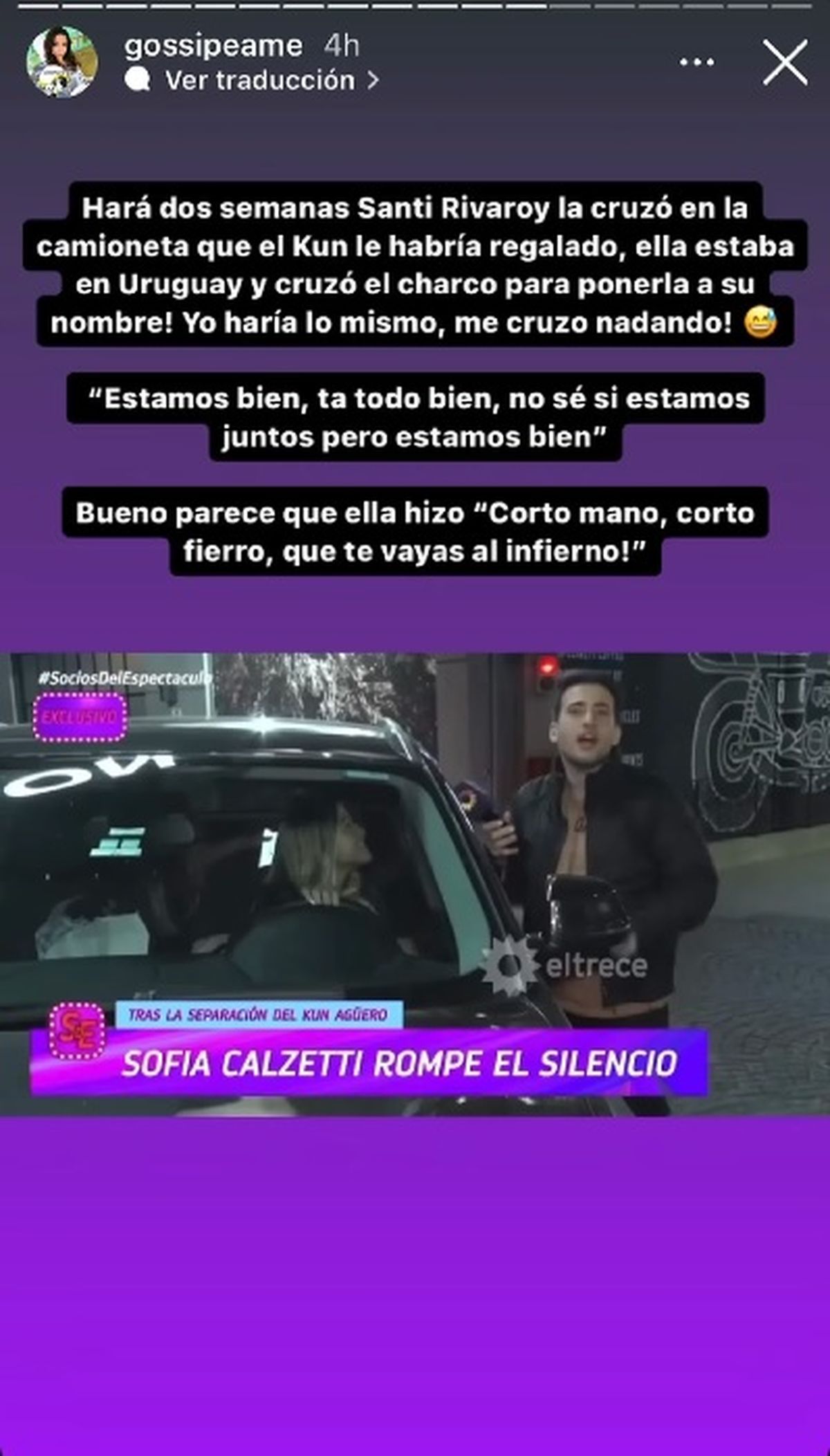Por último, en una cuarta Instagram Storie, Pochi de Gossipaeme repasó: “Hará dos semanas, Santi Rivaroy la cruzó en la camioneta que el Kun le habría regalado, ella estaba en Uruguay y ¡cruzó el charco para ponerla a su nombre! Yo haría lo mismo, ¡me cruzo nadando! ‘Estamos bien, está todo bien, no sé si estamos juntos pero estamos bien’. Bueno parece que ella hizo ‘Corto mano, corto fierro, ¡que te vayas al infierno!’”, sobre la entrevista que Calzetti había dado a Socios del Espectáculo.
