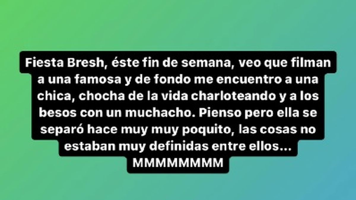 Acto seguido, detalló enigmática: “Fiesta Bresh, este fin de semana, veo que filman a una famosa y de fondo me encuentro a una chica, chocha de la vida charloteando y a los besos con un muchacho. Pienso, pero ella se separó hace muy muy poquito, las cosas no estaban muy definidas entre ellos… Mmmm”.