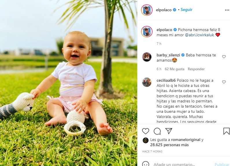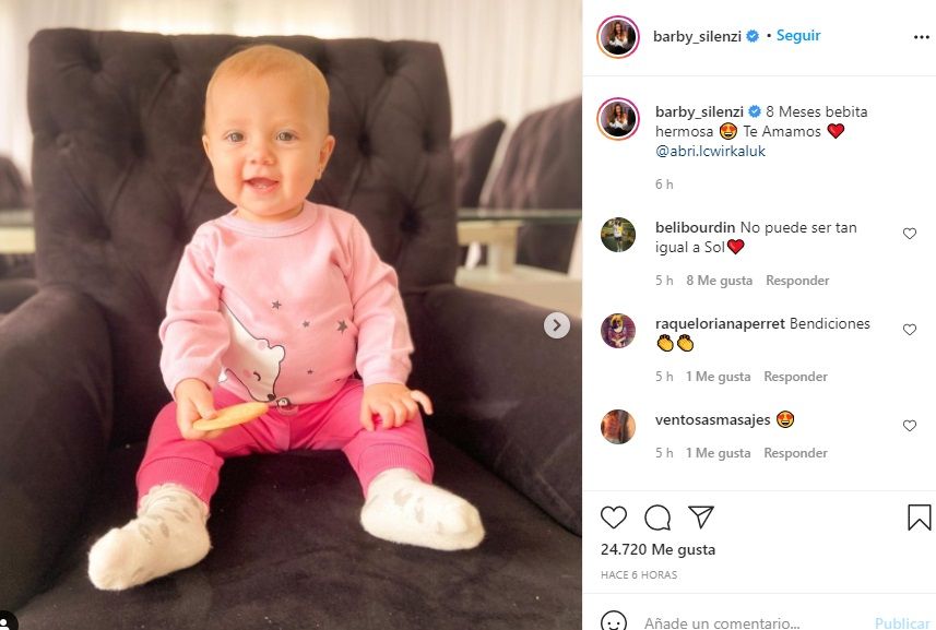 "8 meses bebita hermosa. Te Amamos", indicó ella con corazones rojos en Instagram. “Pichona hermosa, feliz 8 meses mi amor”, describió El Polaco. “Beba hermosa, te amamos”, comentó Barby en el posteo.