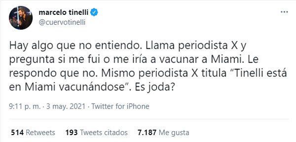 Tinelli, que el próximo lunes 17 de mayo vuelve a la televisión con "ShowMatch, La Academia" tiene 61 años por lo que ya está anotado para recibir la vacuna en provincia de Buenos Aires, en Tigre. De hecho, esta semana empezó el plan de vacunación en la sede de San Lorenzo por lo que es bien posible que sea vacunado allí en breve.