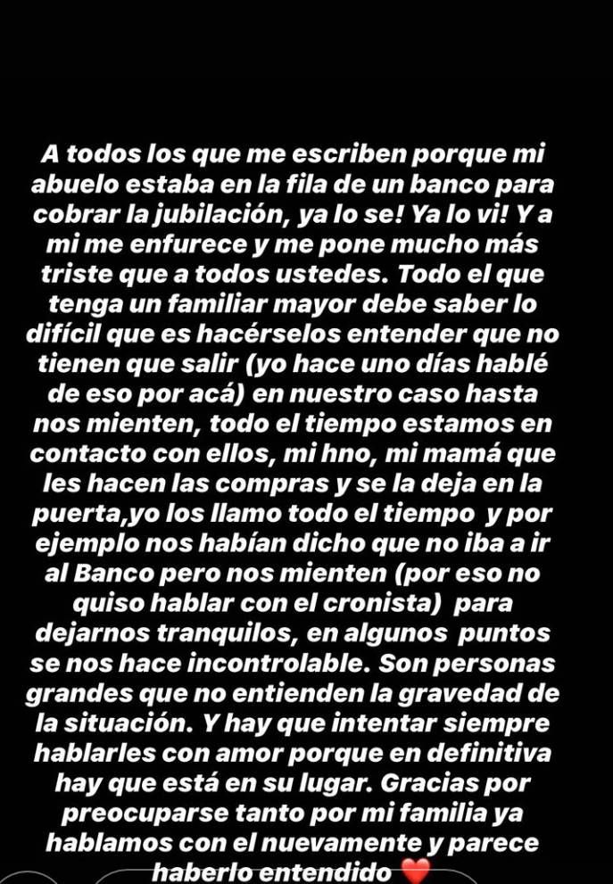 "A todos los que me escriben porque mi abuelo estaba en la fila de un banco para cobrar la jubilación, ya lo sé. Ya lo vi. Y a mi me enfurece y me pone mucho más triste que a todos ustedes. Todo el que tenga un familiar mayor debe saber lo difícil que es hacércelos entender que no tienen que salir en nuestro caso hasta nos mienten", escribió.