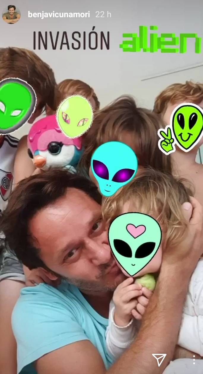 "Invasión alien", escribió el chileno en su Instagram Stories junto a la foto de los cinco niños tapándoles las caras con ilustraciones de extraterrestres, ya que los tres pequeños se sumaron a la cuarentena que tenía el resto de la familia en la casa que tienen en un country de zona norte.