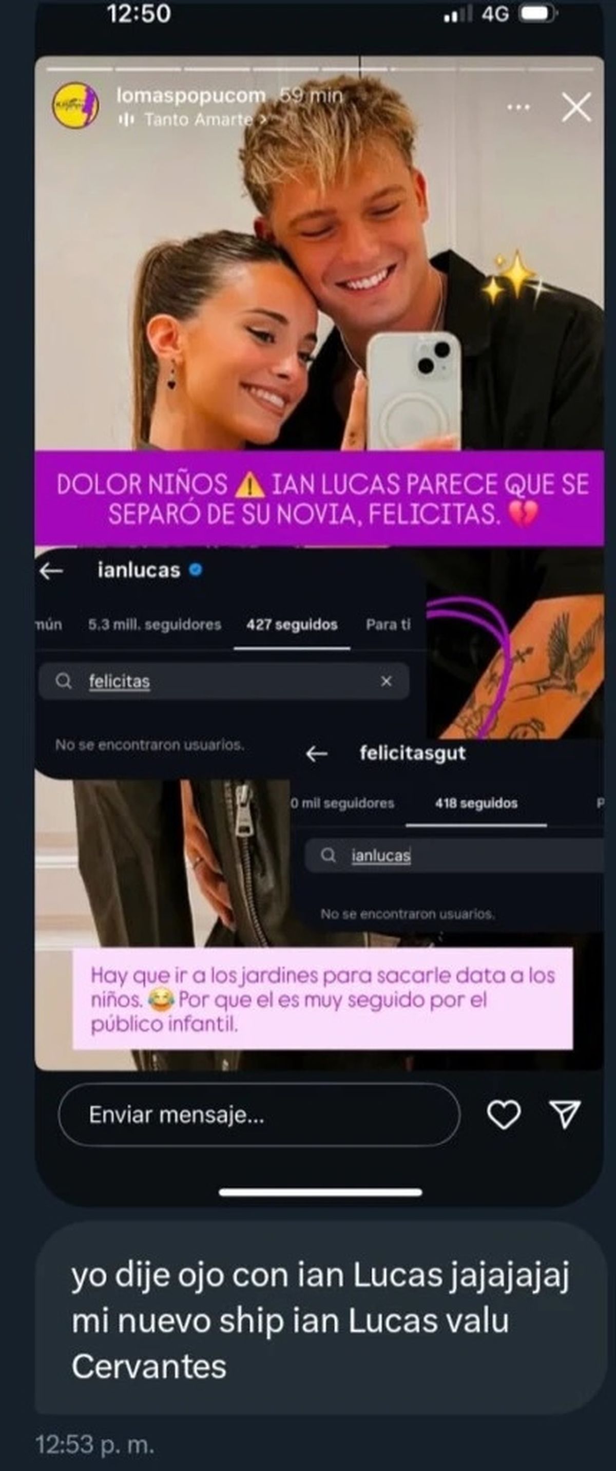 Así lo reflejó la cuenta de Instagram Lomaspopucom, al comprobar que Ian y Felicitas Gut ya no se siguen en el mundo virtual., lo que inmediatamente generó que todas las miradas responsabilicen a Anderson por la ruptura de Lucas.