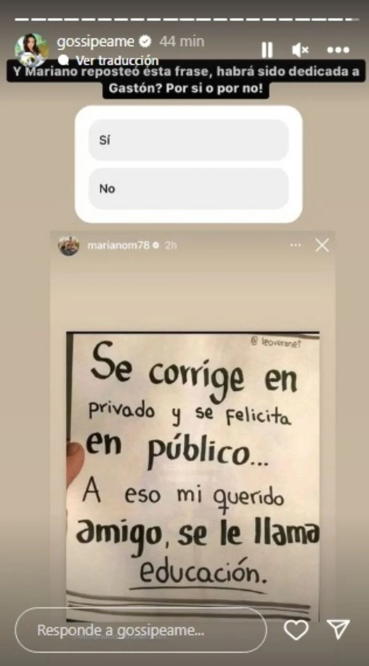 Lo más curioso fue que, casi como una respuesta a Gastón Pauls, Mariano Martínez publicó una historia con una frase sugestiva. "Se corrige en privado y se felicita en público. A eso, mi querido amigo se llama educación", expresó. Para muchos hay un feroz enfrentamiento entre ellos, que quiere salir a la luz.