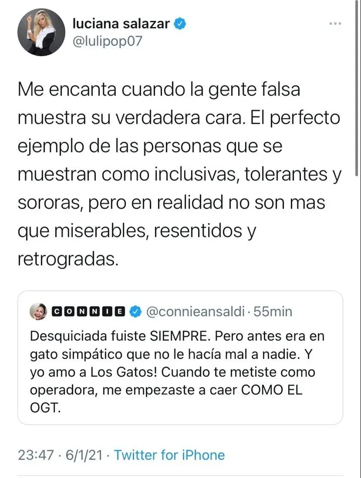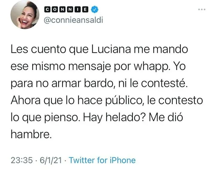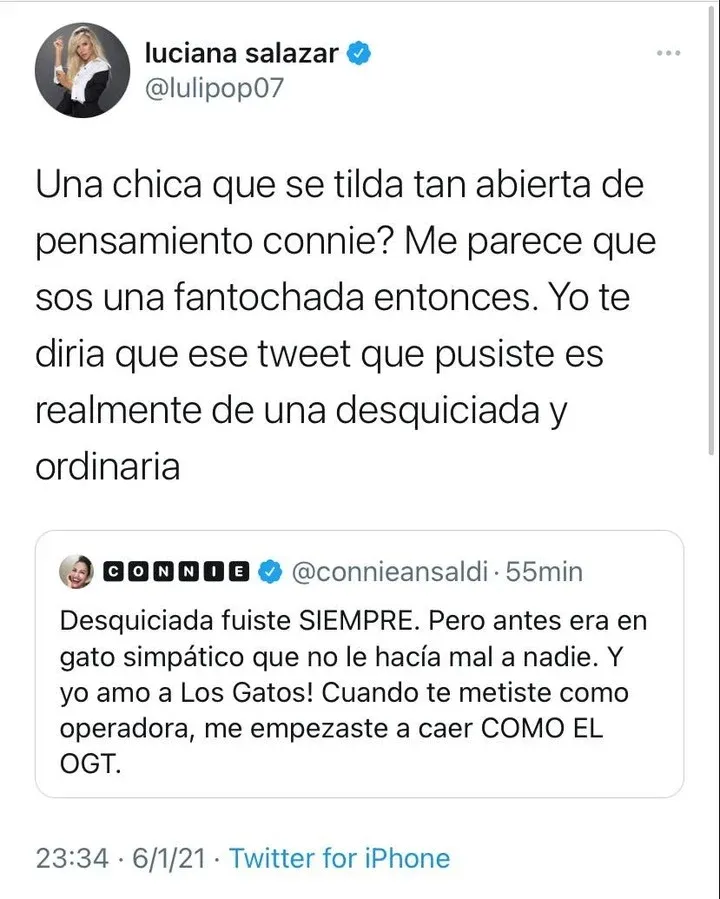 Esas palabras enfurecieron a las platinada, quien en las últimas horas publicó en Twitter una serie de capturas de cuando Connie la halagaba y a su lado agregó: "¿Qué te pasó Connie Ansaldi, ¿la desquiciada soy yo, o vos? Que pasaste de decir que yo era lo más y que me adorabas, a decirme barbaridades públicamente. Me empezaste a agredir de la nada desde que empece a hablar de política. Te metiste en la grieta vos sola, una pena!".