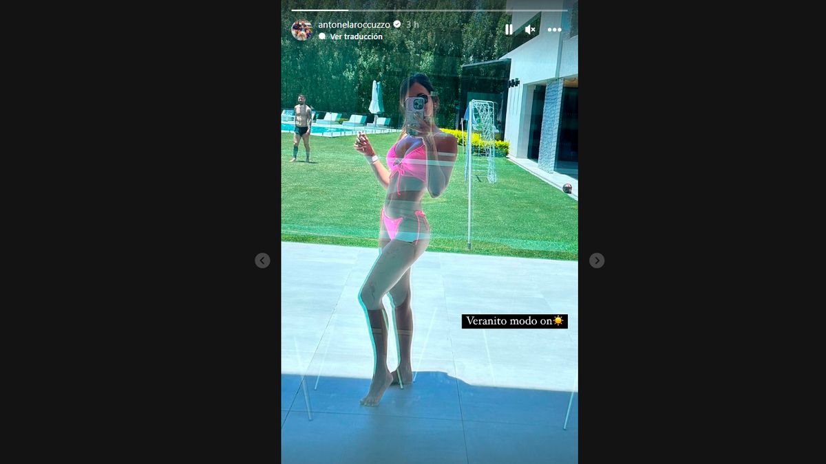 Muchos de sus admiradores desviaron su atención en un detalle de la imagen. Al fondo, en el margen izquierdo, se lo puede ver a Messi caminando por el jardín en shorts y sin remera, intentando ver a lo lejos qué era lo que estaba haciendo su pareja.