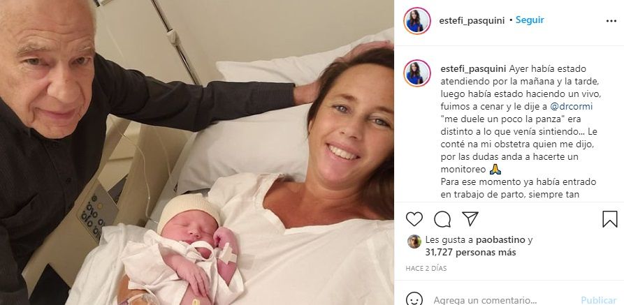 Pasquini comentó luego en un posteo cómo fue el momento del nacimiento de su hijo: "Había estado atendiendo por la mañana y la tarde, luego había estado haciendo un vivo, fuimos a cenar y le dije a @drcormi "me duele un poco la panza" era distinto a lo que venía sintiendo... Le conté na mi obstetra quien me dijo, por las dudas anda a hacerte un monitoreo".