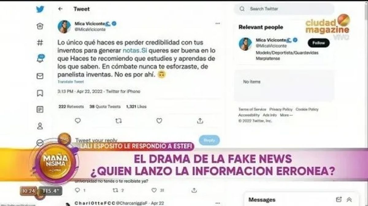 En Mañanísima (Ciudad Magazine), Pampito le mostró a su compañera un tuit de Mica, sin aclarar que se trataba de una publicación del pasado, y Estefi explotó: "Amo esto, no lo había visto, me encanta, justo Mica que es una nada. Ella me dice que estudie cuando estudio, creo que ella no estudia nada, yo sí voy a la facultad”.