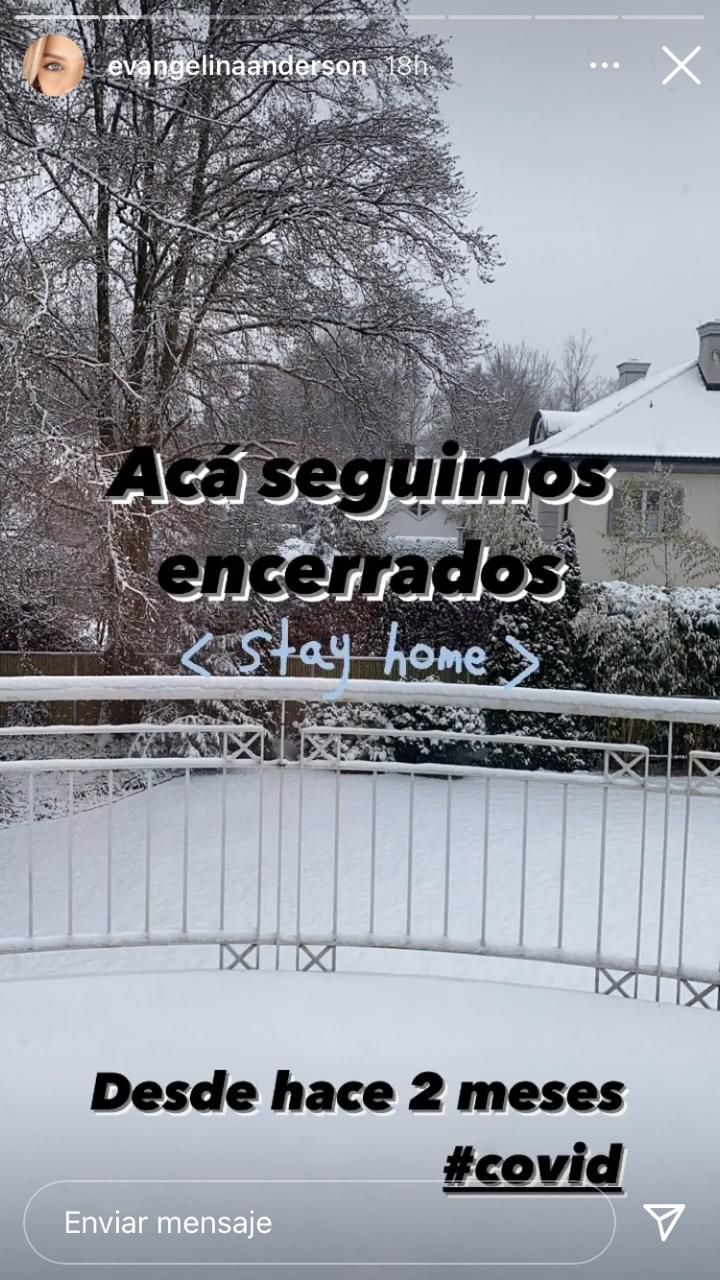 Anderson comienza una serie de historias diciendo: "Acá seguimos encerrados, desde hace dos meses." La modelo continua con el relato y agrega: "Los cines, restaurantes y pubs, están totalmente cerrados en Alemania como parte de las medidas del país para frenar la propagación del Covid-19."