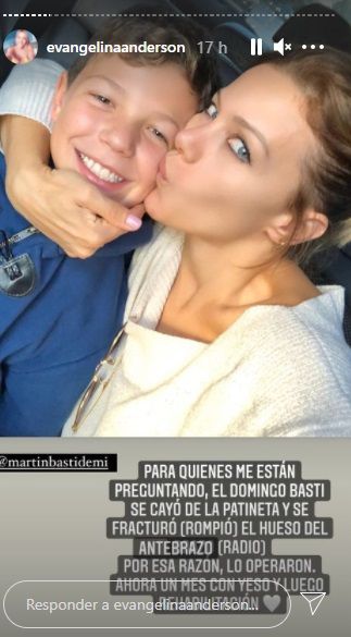 Luego, explicó qué le pasó a su hijo: "Para quienes me están preguntando, el domingo Basti se cayó de la patineta y se fracturó el hueso del antebrazo (radio)".
