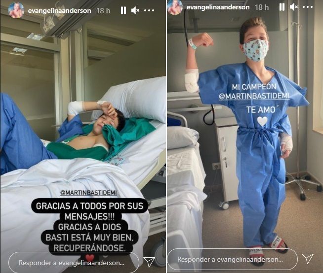 "Gracias a Dios Basti está muy bien, recuperándose. Te amo", indicó Eva desde sus historias en la habitación de la clínica donde fue operado su hijo.