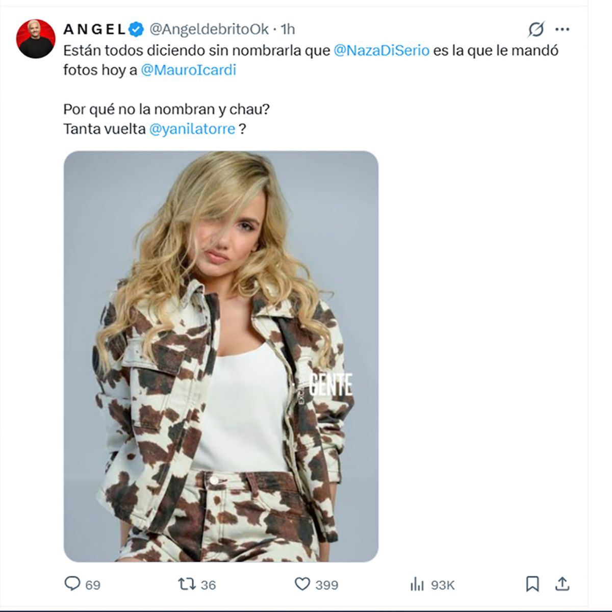 El misterio parecía no tener fin hasta que Ángel de Brito decidió exponerlo y escribió en sus redes sociales: “Están todos diciendo sin nombrarla que Naza Di Serio es la que le mandó fotos hoy a Mauro Icardi”.