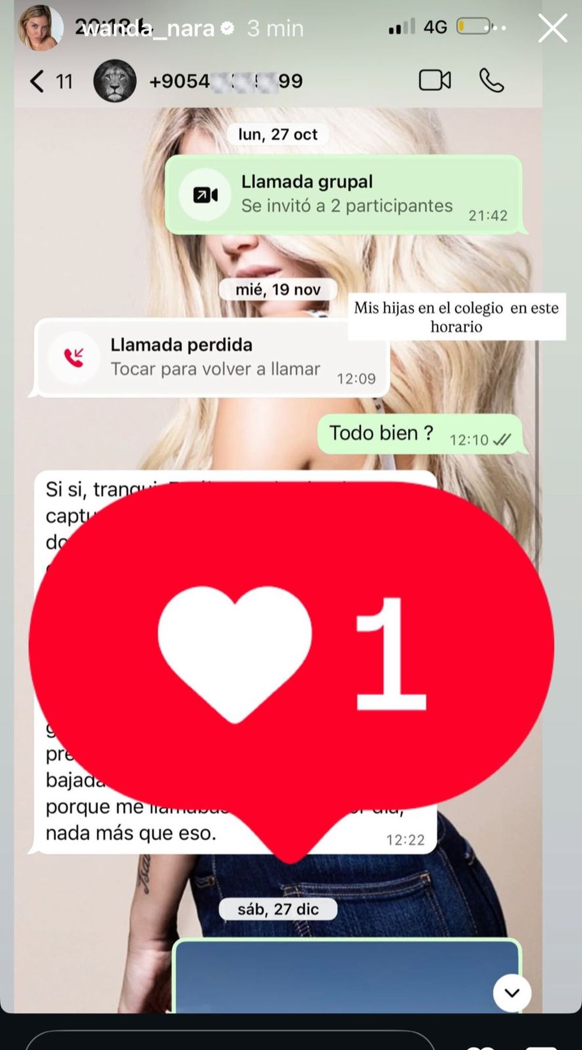 En una de las capturas que compartió, Wanda escribió: “Mis hijas en el colegio en ese horario”, acompañando la frase con una imagen donde se observa un chat en el que Icardi le habría preguntado “¿todo bien?”. El resto del mensaje aparece parcialmente cubierto con un sticker de Instagram, lo que despertó aún más especulaciones entre sus seguidores.