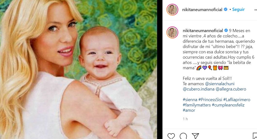 “9 Meses en mi vientre ,4 años de colecho.....a diferencia de tus hermanas, queriendo disfrutar de mi "ultimo bebe"!! ?? jaja, siempre con esa dulce sonrisa y tus ocurrencias casi adultas. Hoy cumplis 6 años .....y seguís siendo ´la bebita de mamá´”, escribió la modelo.