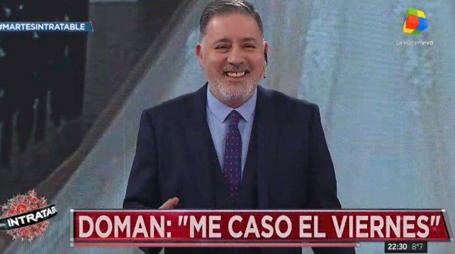 Fabián Doman anunció esta semana su casamiento durante la emisión del programa "Intratables", América TV."El viernes (por hoy) me caso a la mañana. Después de la ceremonia habrá un pequeño coctel", dijo el conductor.