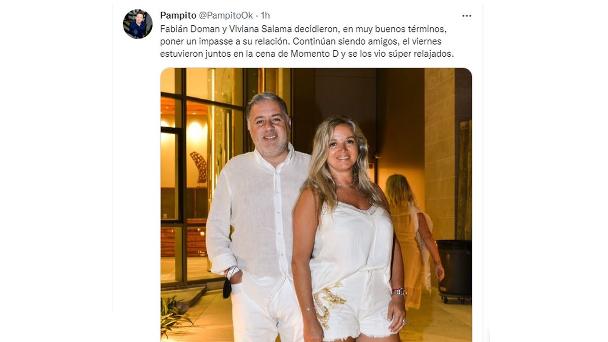 "Fabián Doman y Viviana Salama decidieron, en muy buenos términos, poner un impasse a su relación. Continúan siendo amigos, el viernes estuvieron juntos en la cena de Momento D y se los vio súper relajados", precisó Pampito.
