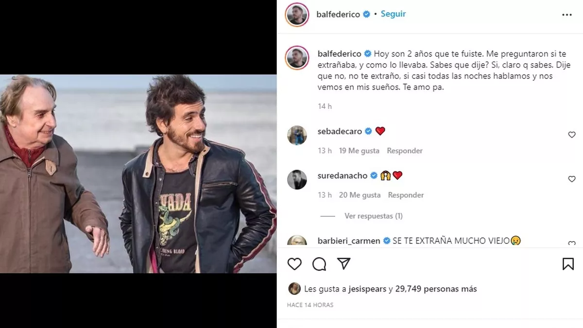 "Hoy son 2 años que te fuiste. Me preguntaron si te extrañaba, y como lo llevaba. Sabes que dije? Si, claro que sabes. Dije que no, no te extraño, si casi todas las noches hablamos y nos vemos en mis sueños. Te amo pa", expresó sentido Fede Bal en un posteo de Instagram del jueves con una imagen de la película Rumbo al mar que protagonizaron en 2018. Fede y Santiago tenían un vínculo muy fuerte.