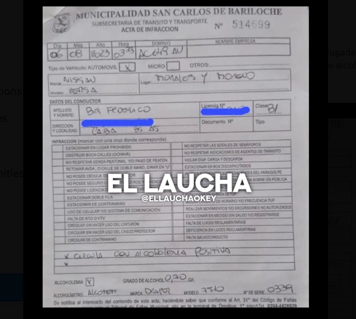 "Los registros dieron 0,70 de alcohol en sangre cuando se le requirió que soplara el alcoholímetro de los agentes municipales. La retención de la licencia de conducir según el número que arrojó el actor es por 30 días y deberá abonar una multa de $76.500", informó el medio.