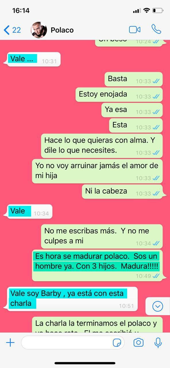 Y allí aparece la actual pareja del cantante, Barby Silenzi, en el chat: "Vale soy Barby, ya está con esta charla".