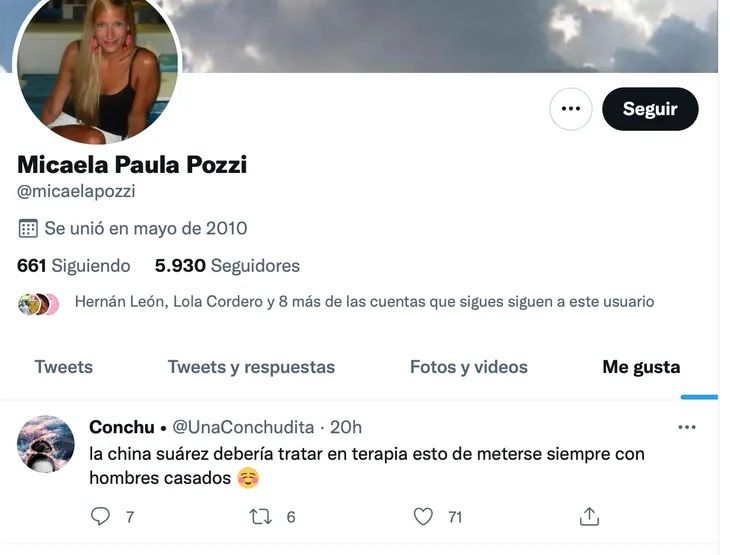 En Twitter, la joven le puso like a un mensaje aludiendo al historial amoroso de Suárez. "La China Suárez debería tratar en terapia esto de meterse siempre con hombres casados", decía el tuit.