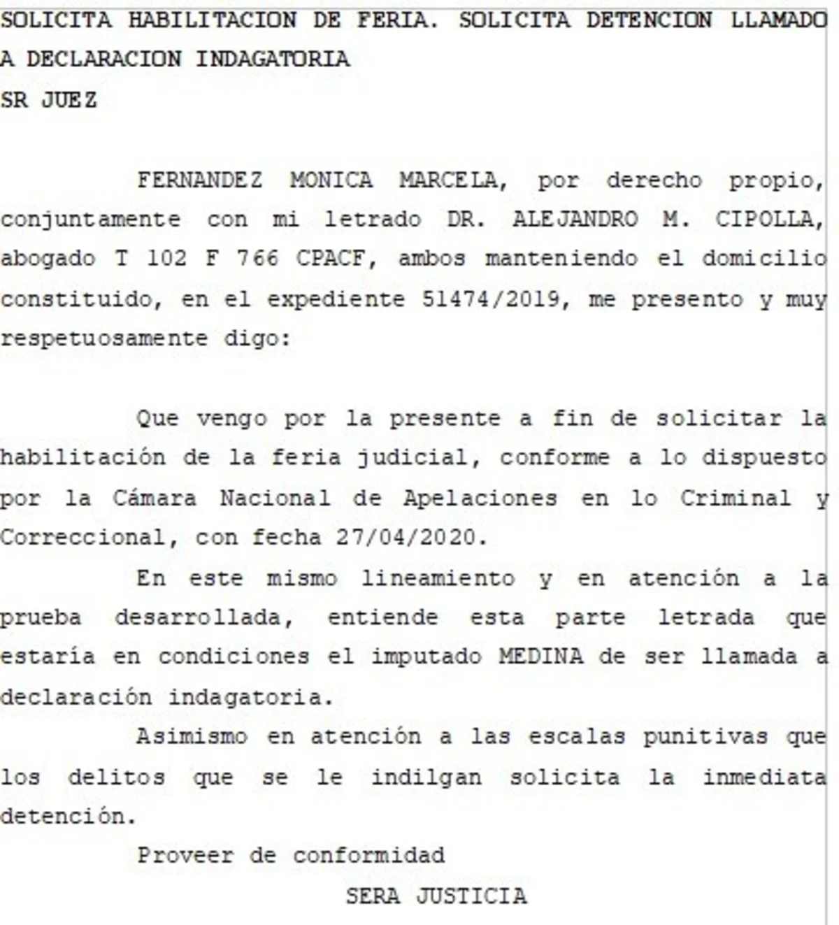 Ahora bien, luego de que la denuncia tomara estado público, la investigación de la causa comenzó de inmediato. Pero la pandemia de coronavirus ralentizó los tiempos de la Justicia y por eso Alejandro Cipolla, abogado de Fernández, solicitó a comienzos de este mes la "habilitación de feria" para que se le tome "declaración indagatoria" a Medina y, además, pidió su "inmediata detención".