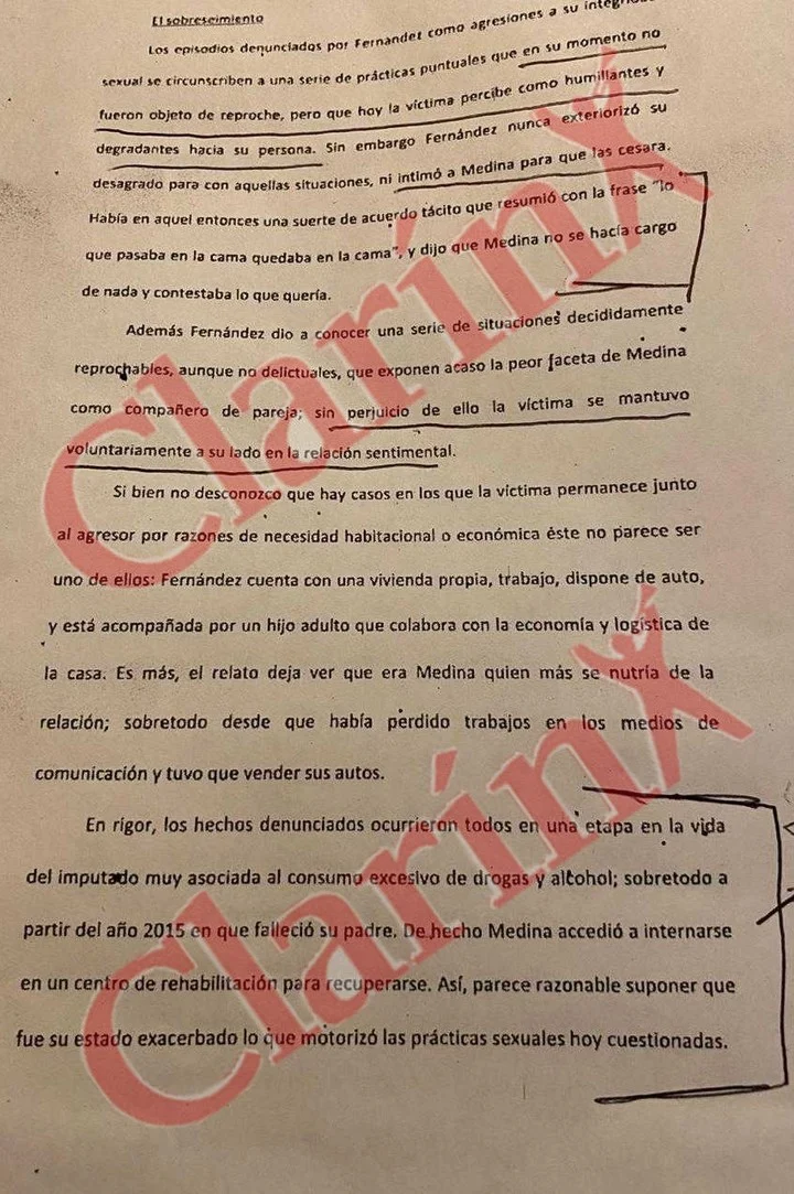 En ese sentido, sostiene para justificar su pedido que "Fernández nunca exteriorizó su desagrado para con aquellas situaciones ni intimó a Medina para que las cesara". Y suma: "Había en aquel entonces una suerte de acuerdo tácito que (Fernández) resumió con la frase 'lo que pasaba en la cama, quedaba en la cama'".
