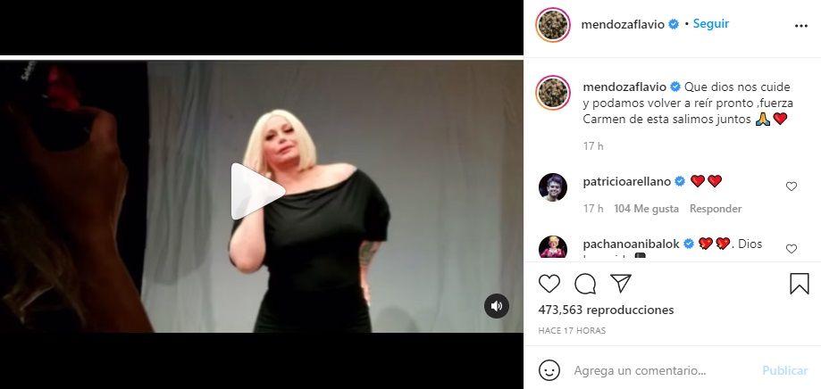 "Que dios nos cuide y podamos volver a reír pronto ,fuerza Carmen de esta salimos juntos", indicó en Instagram junto a un breve video para desearle una pronta recuperación a la actriz.