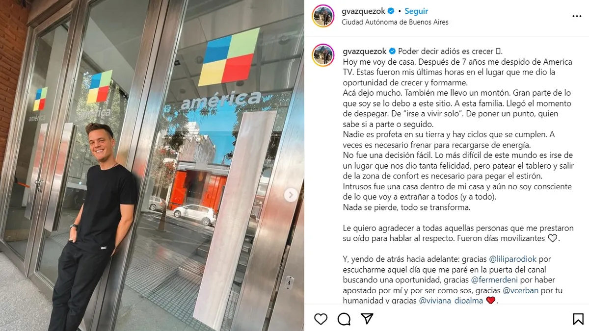 Gonzalo Vázquez dejó el ciclo Intrusos, América Tv, el pasado 31 de enero tras casi diez años de trabajar en el canal América Tv y por un sueño en conjunto con su novia, Agustina Lucero.