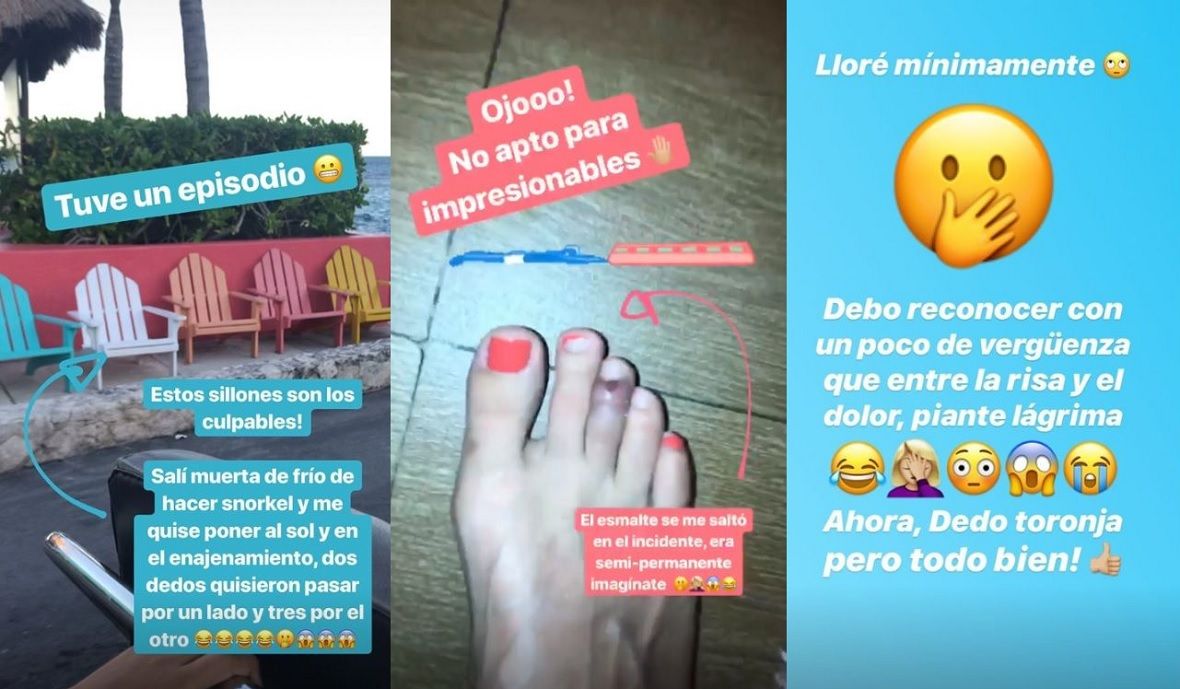 A través de su cuenta en Instagram, la ex "Floricienta" relató qué le pasó: "Tuve un episodio. ¡Estos sillones son los culpables! Salí muerta de frío de hacer snorkel y me quise poner al sol y en el enajenamiento dos dedos quisieron pasar por un lado y tres por otro", escribió, junto a una imagen de los asientos "responsables" de su golpe.