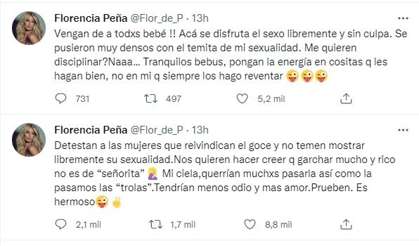 "Detestan a las mujeres que reivindican el goce y no temen mostrar libremente su sexualidad. Nos quieren hacer creer que garchar mucho y rico no es de “señorita”Mujer llevándose la palma de la mano a la cara Mi ciela,querrían muchxs pasarla así como la pasamos las “trolas”.Tendrían menos odio y mas amor.Prueben. Es hermoso", sentenció Peña.