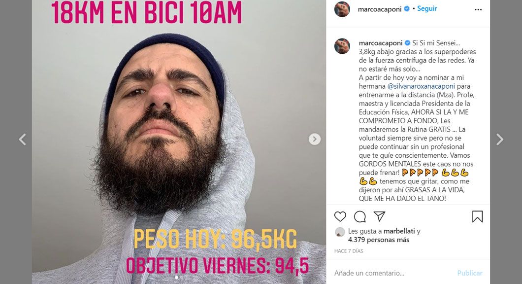 "3,8kg abajo gracias a los superpoderes de la fuerza centrífuga de las redes", escribió sobre su primera semana, luego de haber salido a hacer casi 20 kilómetro de bicicleta. Ahora, con la supervisión de su hermana, profesora de educación física, desde Mendoza monitorea los ejercicios y la dieta del artista. "Son los únicos que pueden brindarnos verdadera Salud y no resultados estéticos y efímeros", afirmó sobre la labor de su hermana y colegas.