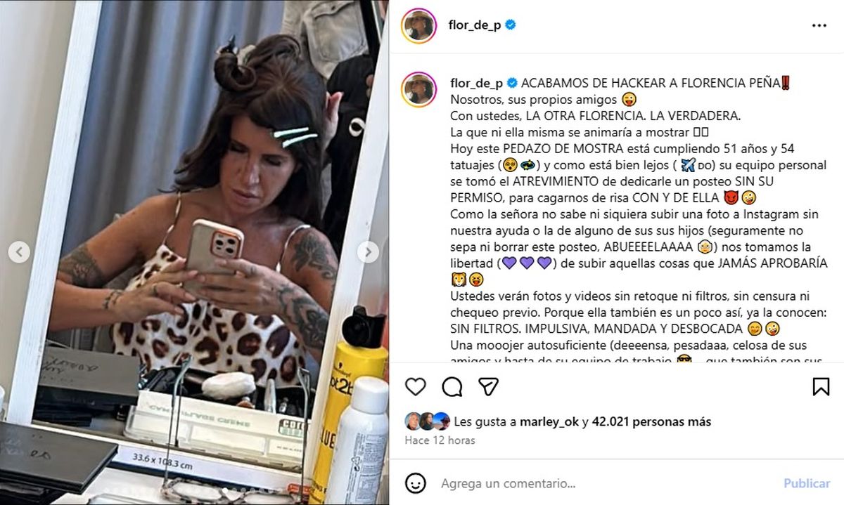 Claro que el mensaje del posteo no terminó ahí, porque el equipo de Florencia la retrató con un mix de anécdotas de vida pública y privada: “Ella es el Teatro Liceo y Divas Play a la vez. Es un viaje en familia y también un canje de pezoneras. Aunque le cueste admitir, es una Moni Argento versión triple X. Es una estrella máxima del teatro argentino, pero también la remisera del grupo que deja a cada uno en la puerta de su casa al final del día. Te discute por política y al mismo tiempo te pelea por un pedazo de torta. Es la que graba contenido en su cocina, pero no te lava ni una cuchara. Florencia Peña es así, humana. Como todos. Y siempre tiene un haz bajo la manga… y hasta cuando la dan por muerta, está vivita y coleando”.