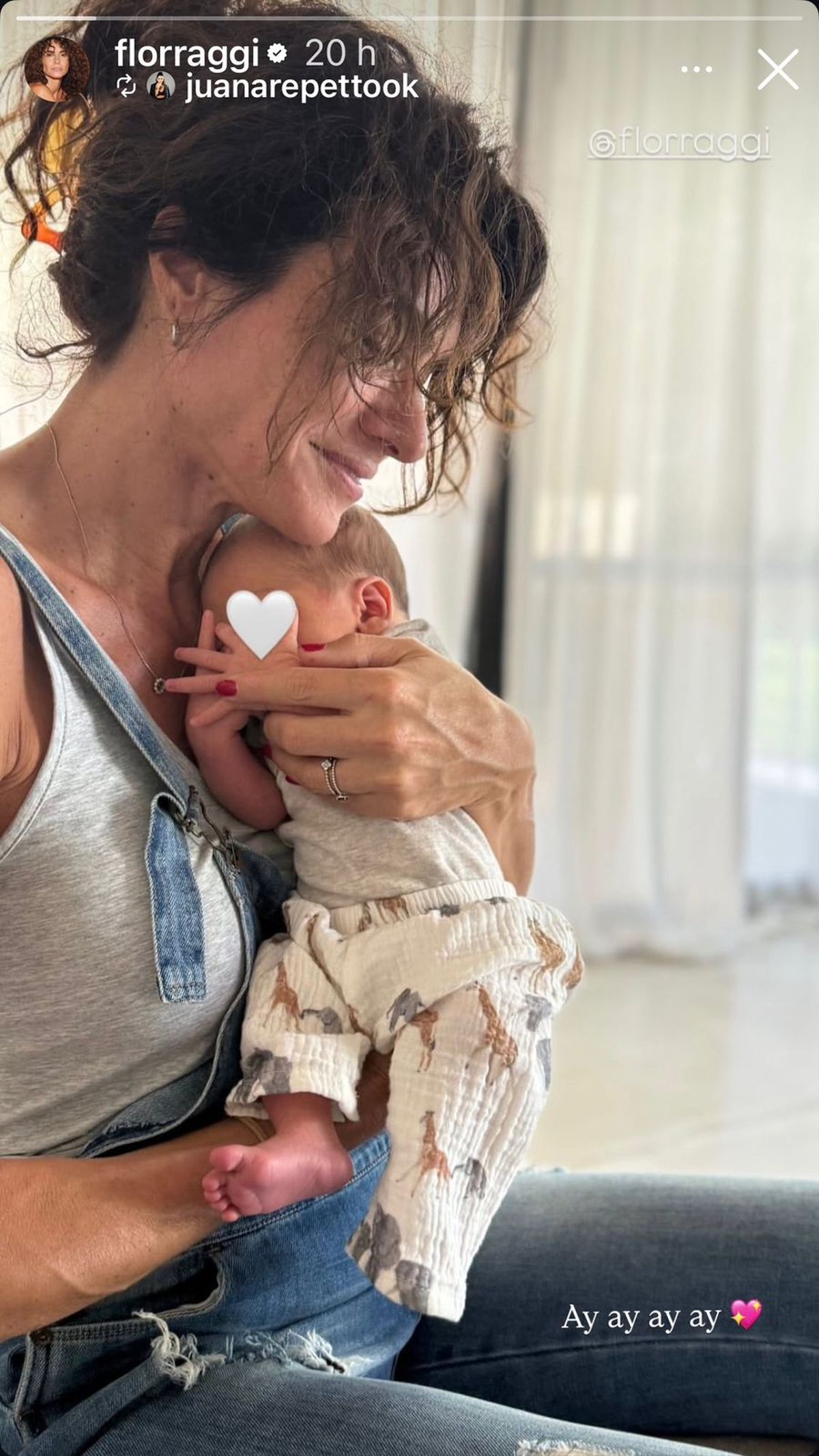 En las últimas horas, quien tuvo su esperado encuentro con el recién nacido fue Florencia Raggi, pareja de Nicolás Repetto desde hace más de tres décadas. La actriz no ocultó su ternura y decidió publicar en sus historias una imagen que habla por sí sola: sentada, con una sonrisa amplia y sosteniendo con suma delicadeza a Timoteo entre sus brazos. La postal, que originalmente había sido subida por Juana, fue replicada por Raggi junto a una frase tan breve como elocuente: “Ay ay ay ay”, acompañada por un corazón que resumió el sentimiento del momento.