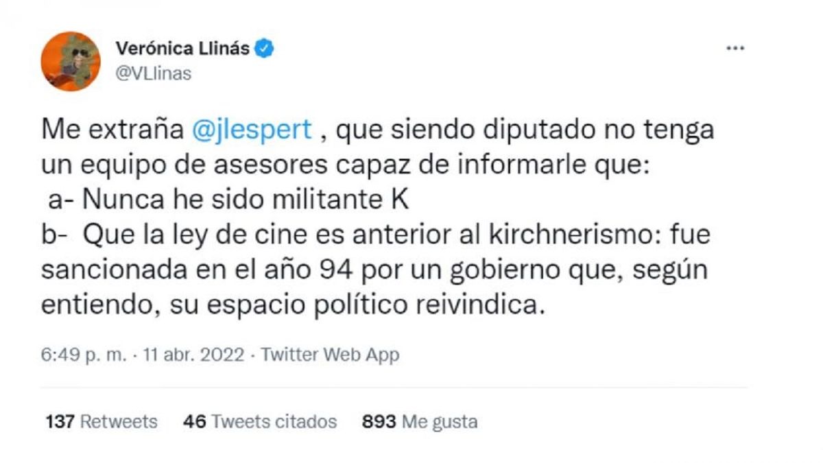 Por último, Llinás señaló: "De todos modos me llama la atención que de todo lo que le contesté, la discusión pase para usted por si soy o no soy K. Bah, no."