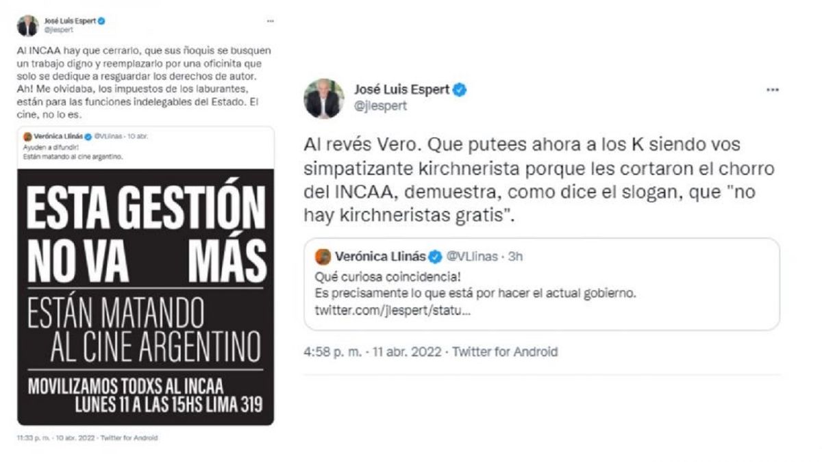 Pero el diputado le recordó a la actriz su filiación kirchnerista: "Que putees ahora a los K siendo vos simpatizante kirchnerista porque les cortaron el chorro del INCAA demuestra, como dice el eslogan, que ‘no hay kirchneristas gratis'".