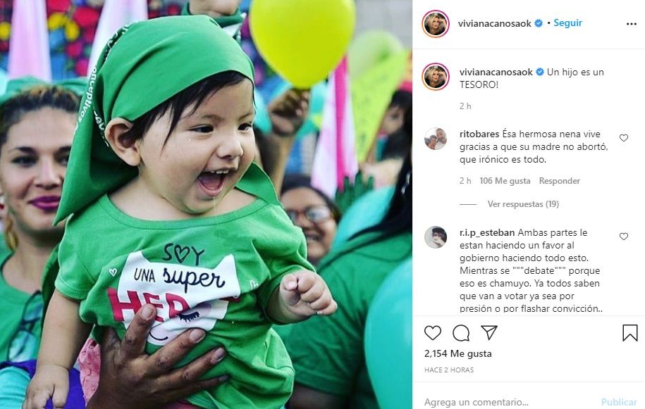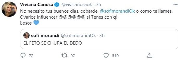 Por su parte, Viviana, en favor de "las dos vidas" (pañuelo celeste), le contestó picante: "No necesito tus buenos días, cobarde. Sofi Morandi, o como te llames. Ovarios, influencer. Si tenés con qué".