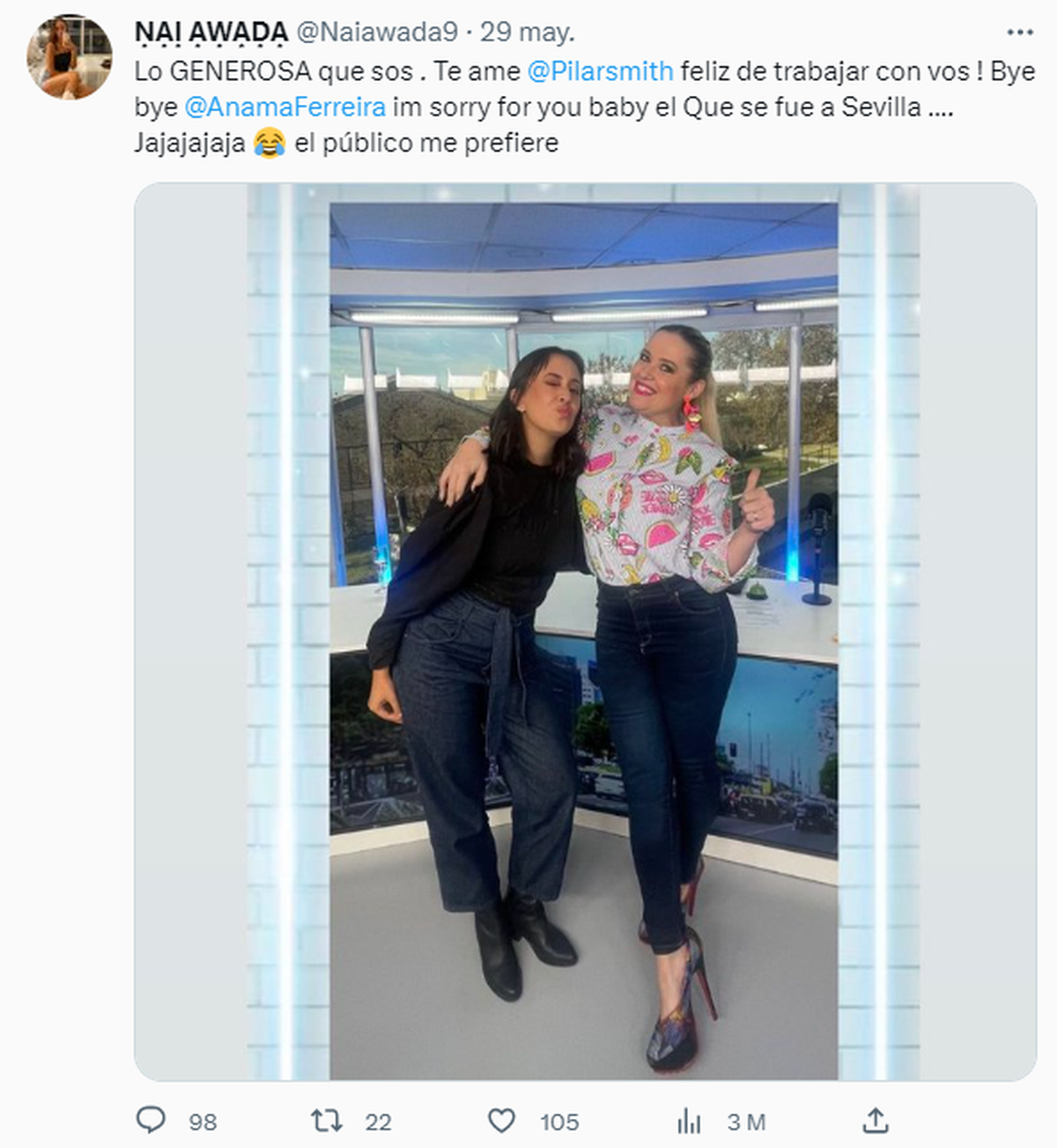En su cuenta de Twitter, Nai le dedicó un palito a la ex modelo. "Lo generosa que sos. ¡Te amé @Pilarsmith, feliz de trabajar con vos! Bye bye @AnamaFerreira. I'm sorry for you, baby. El que se fue a Sevilla... Jajajajaja. El público me prefiere", escribió.