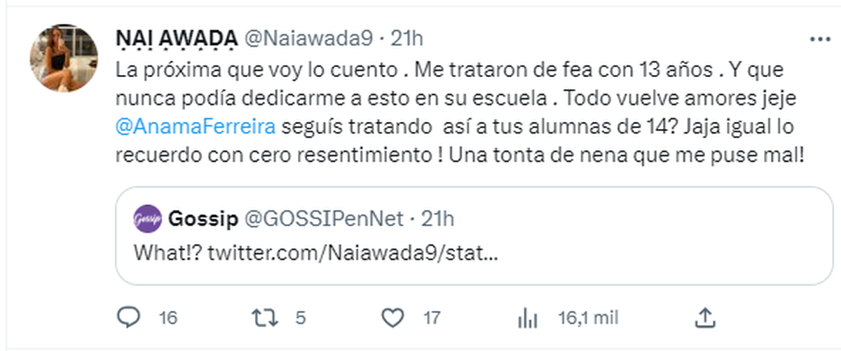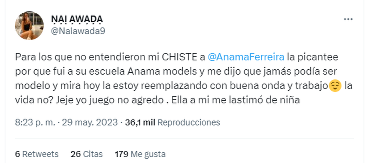 En otro posteo en Twitter, Nai explicó de dónde viene su enfado con Anamá. "Para los que no entendieron mi chiste a @AnamaFerreira la 'picanteé' por que fui a su escuela, Anamá Models, y me dijo que jamás podría ser modelo...", recordó y agregó: "Y mira hoy, la estoy reemplazando con buena onda y trabajo. ¿La vida, no? Jeje Yo juego, no agredo. Ella a mí me lastimó de niña".