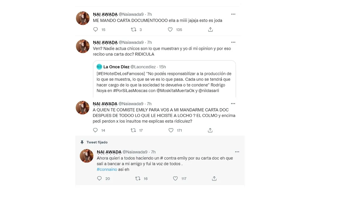 Nai Awada expresó después toda su bronca desde Twitter al recibir una carta documento por parte de Emily tras sus expresiones contra ella en las redes.