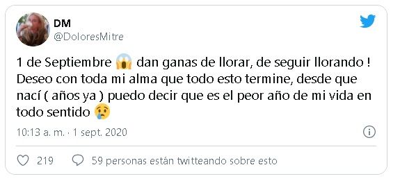 "1 de Septiembre. Dan ganas de llorar, ¡de seguir llorando! Deseo con toda mi alma que todo esto termine, desde que nací (años ya) puedo decir que es el peor año de mi vida en todo sentido", señaló.
