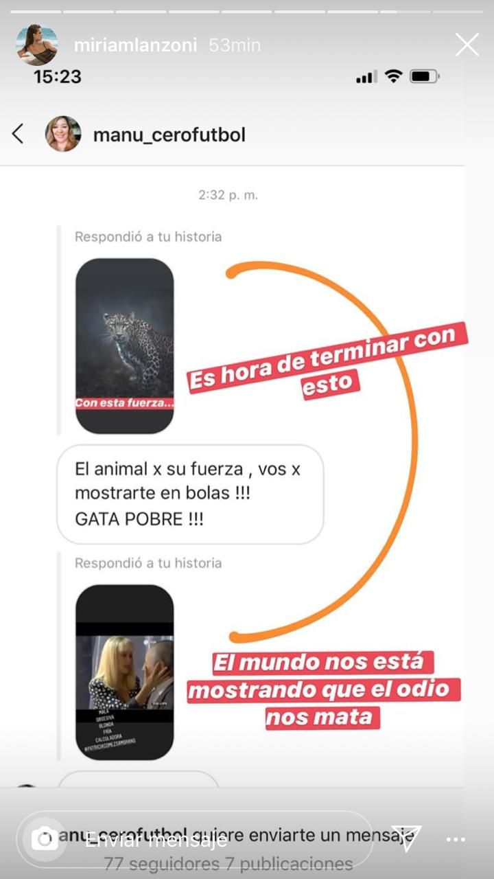 En sus historias la actriz escribe mensajes de ayuda personal, de energía dando ánimos. Entre ellas, publico la foto de un tigre, en la que escribió “Con esta fuerza” y luego sumar un video de su trabajo, una seguidora le contestó de forma muy agresiva. “El animal por su fuerza, vos por mostrarte en bolas. Gata pobre”, entonces Miriam decidió responderle públicamente.