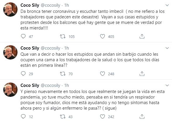 "Da bronca tener coronavirus y escuchar tanto imbécil (no me refiero a los trabajadores que padecen este desastre). Vayan a sus casas estúpidos y protesten desde los balcones qué hay gente que se muere de verdad por esta mierda!!!!", cerró enérgico.