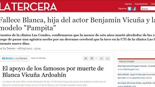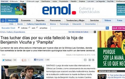 Diario "El Mercurio", anunció: "Tras luchar días por su vida falleció la hija Benjamín Vicuña y "Pampita".