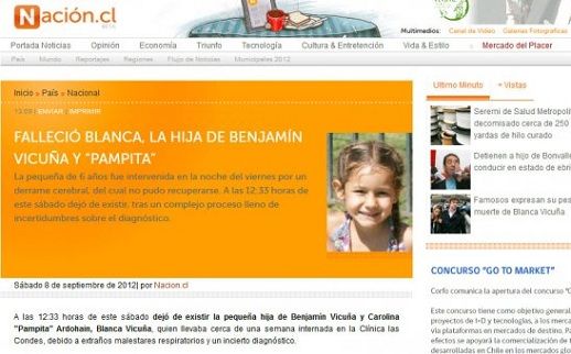 El diario "La Tercera", destacó que fuentes de la clínica Las Condes "confirmaron que la menor de seis años murió cerca de las 11.45 horas tras pasar una agónica noche por un derrame cerebral, que la tuvo en la UTI de la clínica Las Condes durante nueve días".