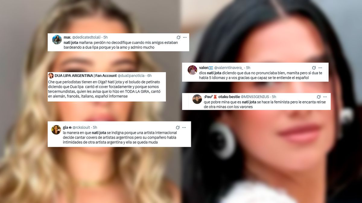 "Che, ¿qué periodistas tienen en Olga? Nati jota y el bol... de Homero Petinato diciendo que Dua lipa cantó el cover forzadamente y porque somos tercermundistas, ¿quién le avisa que lo hizo en TODA LA GIRA, cantó en alemán, francés, italiano, español... informense", "A ningún argentino de bien les importa nada de lo que pueda decir Nati Jota y Homero Petinato", "Bueno, Nati Jota tiene 30 y sigue jodiendo con Cris Morena y sus series… su vara es esa", "Nati Jota mañana: 'perdón no decodifique cuando mis amigos estaban bardeando a Dua Lipa porque yo la amo y admiro mucho", "Dios Nati Jota diciendo que Dua no pronunciaba bien, mamita pero si Dua te habla 5 idiomas y a vos gracias que capaz se te entiende el español", fueron algunos de los mensajes que se replicaron en X.