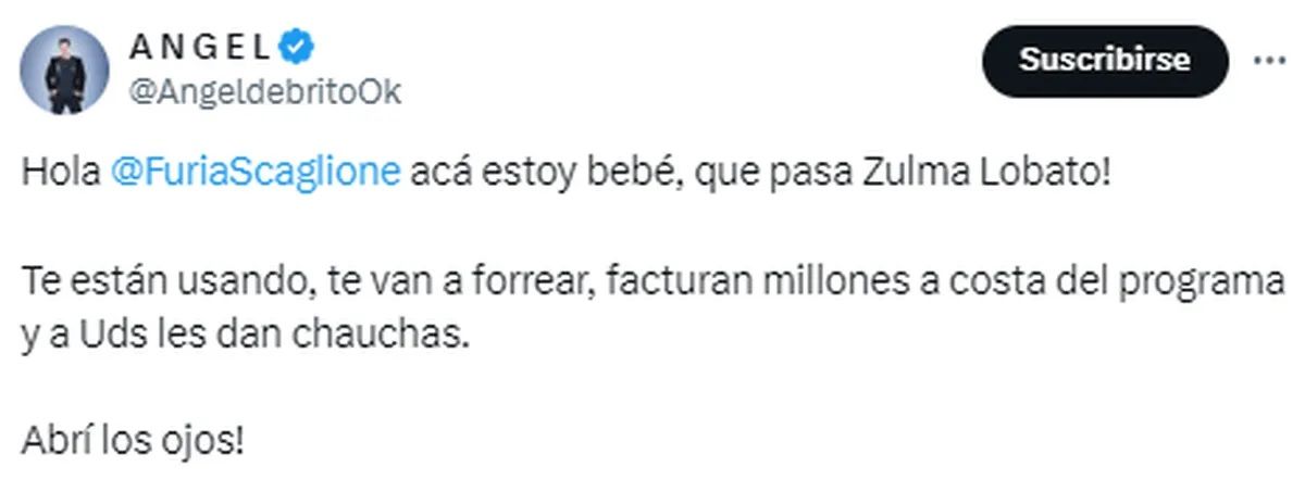 Por último, Ángel le dio un consejo a la estratega. "Te están usando, te van a forrear, facturan millones a costa del programa y a Uds les dan chauchas. Abrí los ojos!", advirtió picante.