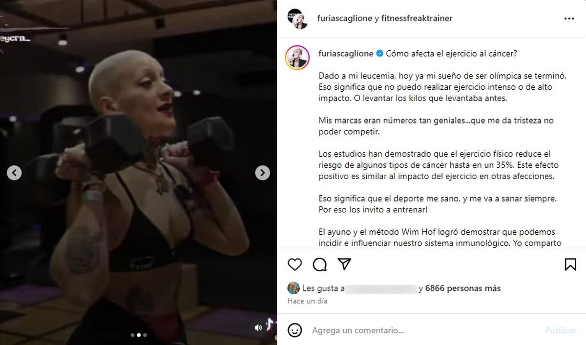 En tanto, reflexionó esperanzada frente a sus casi 800 mil seguidores: "Eso significa que el deporte me sano, y me va a sanar siempre. Por eso los invito a entrenar".