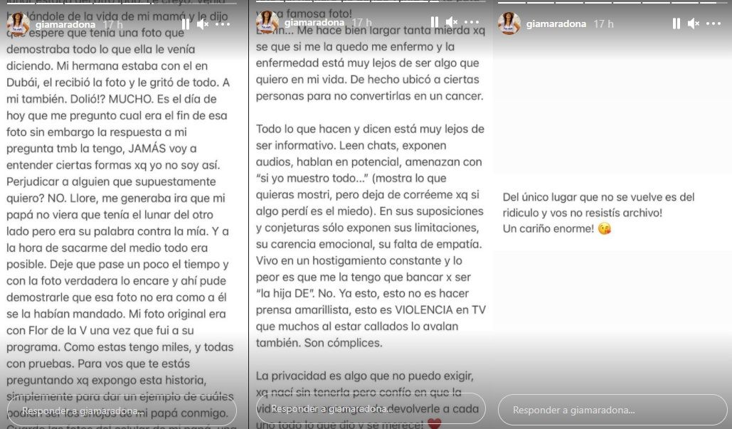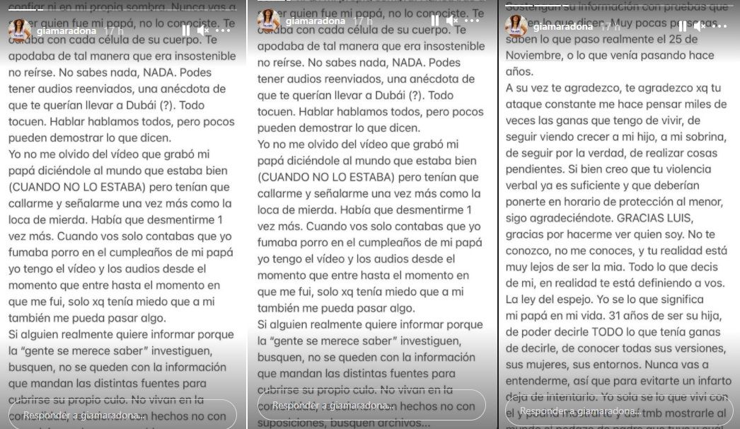 Y agregó: “Mientras vos das por hecho, que tanto Dalma como yo, somos las responsables del final de la vida de mi papá, yo estoy preocupada porque aún circulan las fotos de mi papá con los dos rancios ese put...miércoles 25. Preocupada porque no puedo confiar en mi propia sombra. Nunca vas a saber quién fue mi papá, no lo conociste. Te odiaba con cada célula de su cuerpo. Te apodaba de tal manera que era insostenible no reírse. No sabes nada, NADA. Podés tener audios reenviados, una anécdota de que te querían llevar a Dubai (?). Todo cuento. Hablar hablamos todos, pero pocos pueden demostrar lo que dicen. Yo no me olvido del video que grabó mi papá diciéndole al mundo que estaba bien (cuando no lo estaba), pero tenían que callarme y señalarme una vez más como la loca de mierda. Había que desmentirme una vez más. Cuando vos sólo contabas que yo fumaba porro en el cumpleaños de mi papá, yo tengo el video y los audios desde el momento que entré hasta el momento en que me fui, sólo porque tenía miedo que a mí también me pueda pasar algo”.