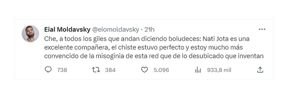 "Che, a todos los giles que andan diciendo boludeces: Nati Jota es una excelente compañera, el chiste estuvo perfecto y estoy mucho más convencido de la misoginia de esta red que de lo desubicado que inventan", lanzó el hijo de Roberto Moldavsky.